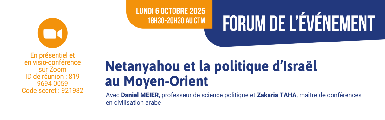 En savoir plusForum de l’événement du lundi 6 octobre 2025: Netanyahou et la politique d’Israël au Moyen-Orient Avec Daniel Meier, professeur de science politique à Sciences Po Grenoble, directeur du master Méditerranée […]